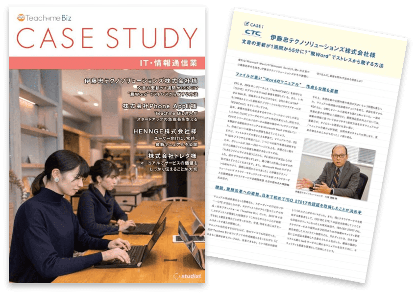 Teachme Bizを導入頂いた情報通信業の企業様にインタビュー。抱えていた課題から、実際に現場でどのようにマニュアルを使い、生産性の向上に繋げたのか4社の事例をご紹介しています。