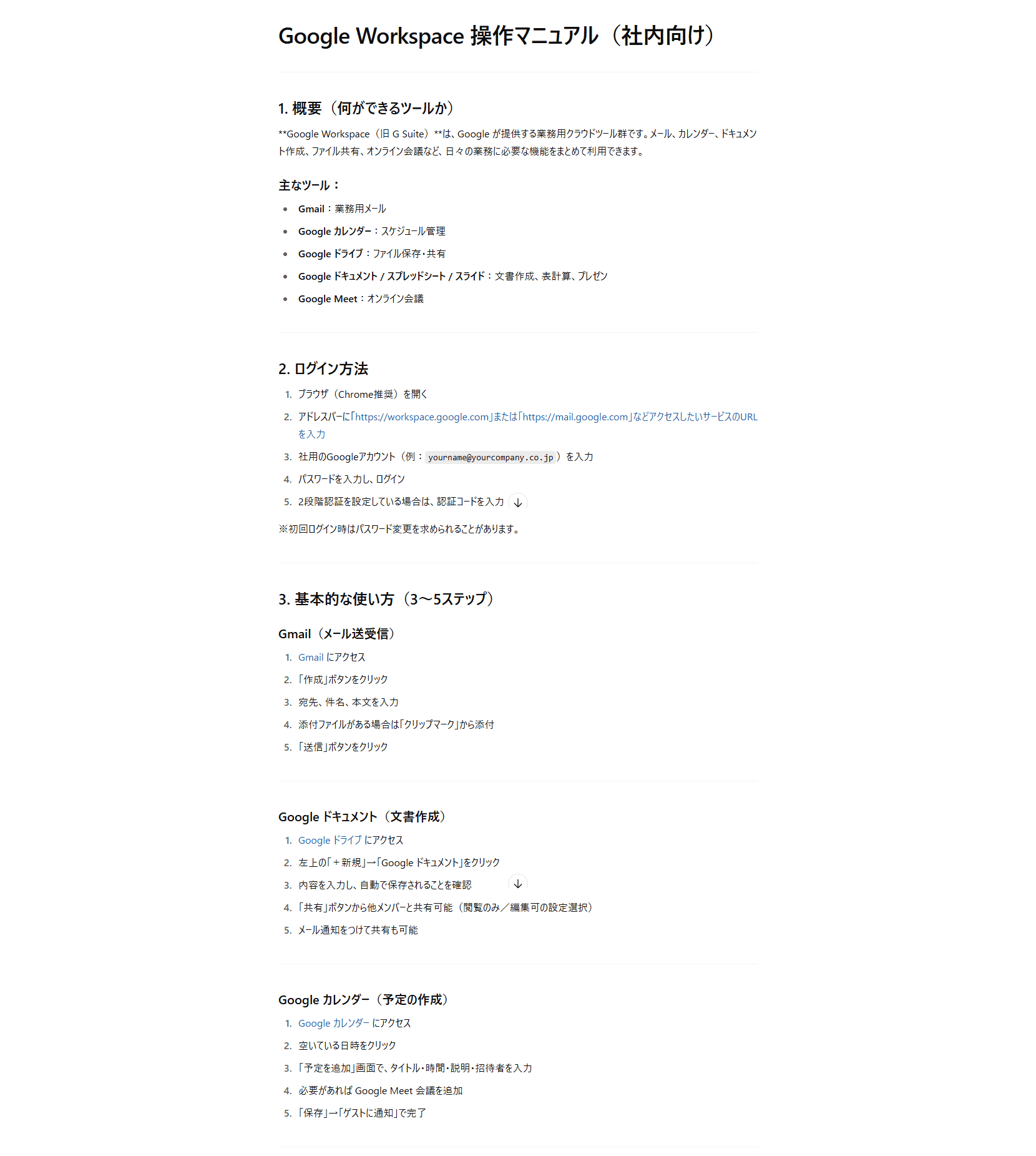 [ツール名(○○ 例:Google Workspace)]について、社内向けの操作マニュアルを作成してください。