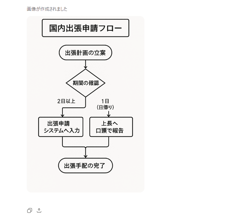 以下、国内出張申請フローを例にしたプロンプトと回答です。ここでは簡単に、ステップ3までを提示しています。