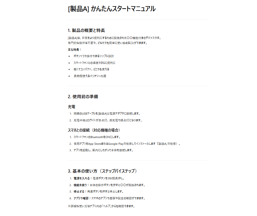 製品の特徴や使用方法をわかりやすく伝えるためには、丁寧でシンプルな説明が重要です。初心者にも理解しやすいマニュアル作成に効果的なプロンプト例は、以下の通りです。