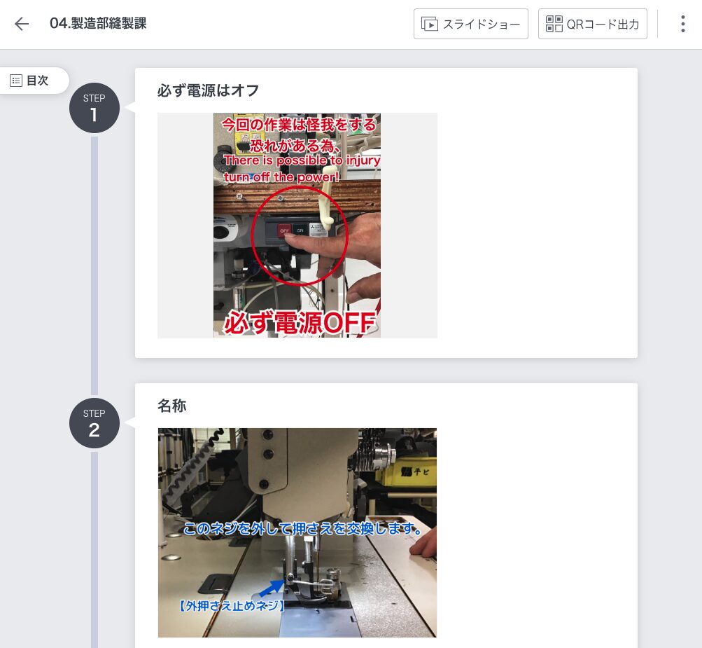 特に効果を感じているのは、安全教育の分野です。事故やトラブルが起きた際は、その都度マニュアルを作成して共有しています。例えば、ミシンでの怪我の事例なども、具体的な状況や予防方法を写真や動画で示すことで、より実践的な安全教育ができるようになりました。