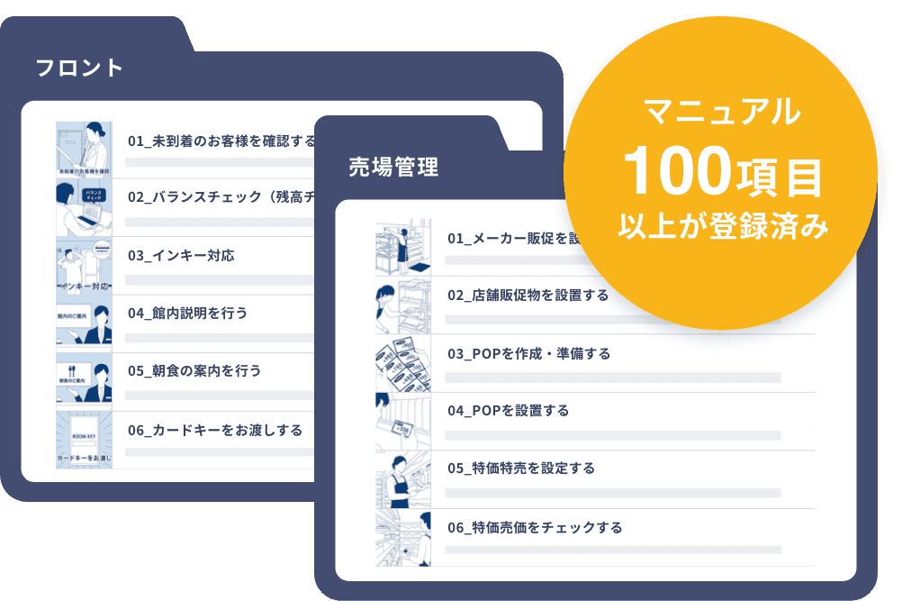 フロント業務や予約管理など宿泊業界で必要とされる基本業務のマニュアルを
